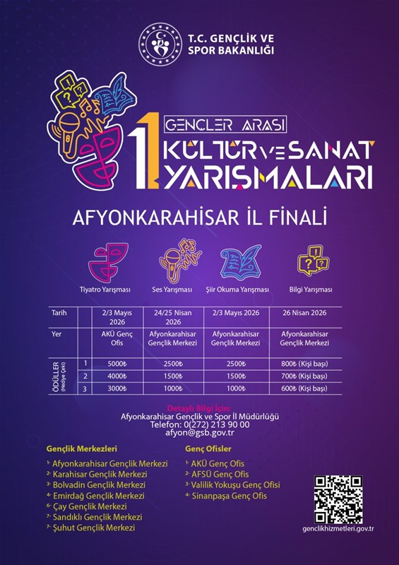 24-25 Nisan 2026 tarihlerinde Afyonkarahisar Gençlik Merkezinde düzenlenecek. Yarışma, 17-25 yaş arası gençler için Solo Geleneksel Müzik ve Solo Popüler Müzik olmak üzere iki kategoride yapılacak. Birinciye 2 bin 500 TL, ikinciye bin 500 TL, üçüncüye ise bin TL hediye çeki verilecek.