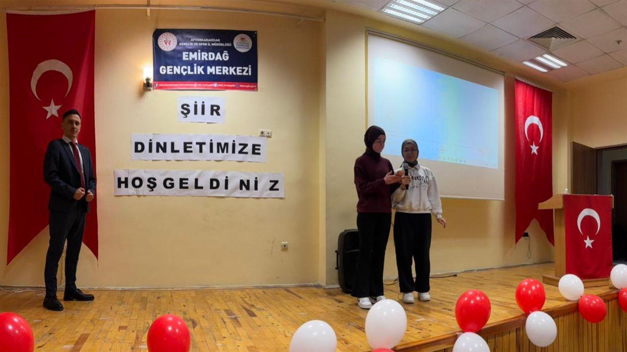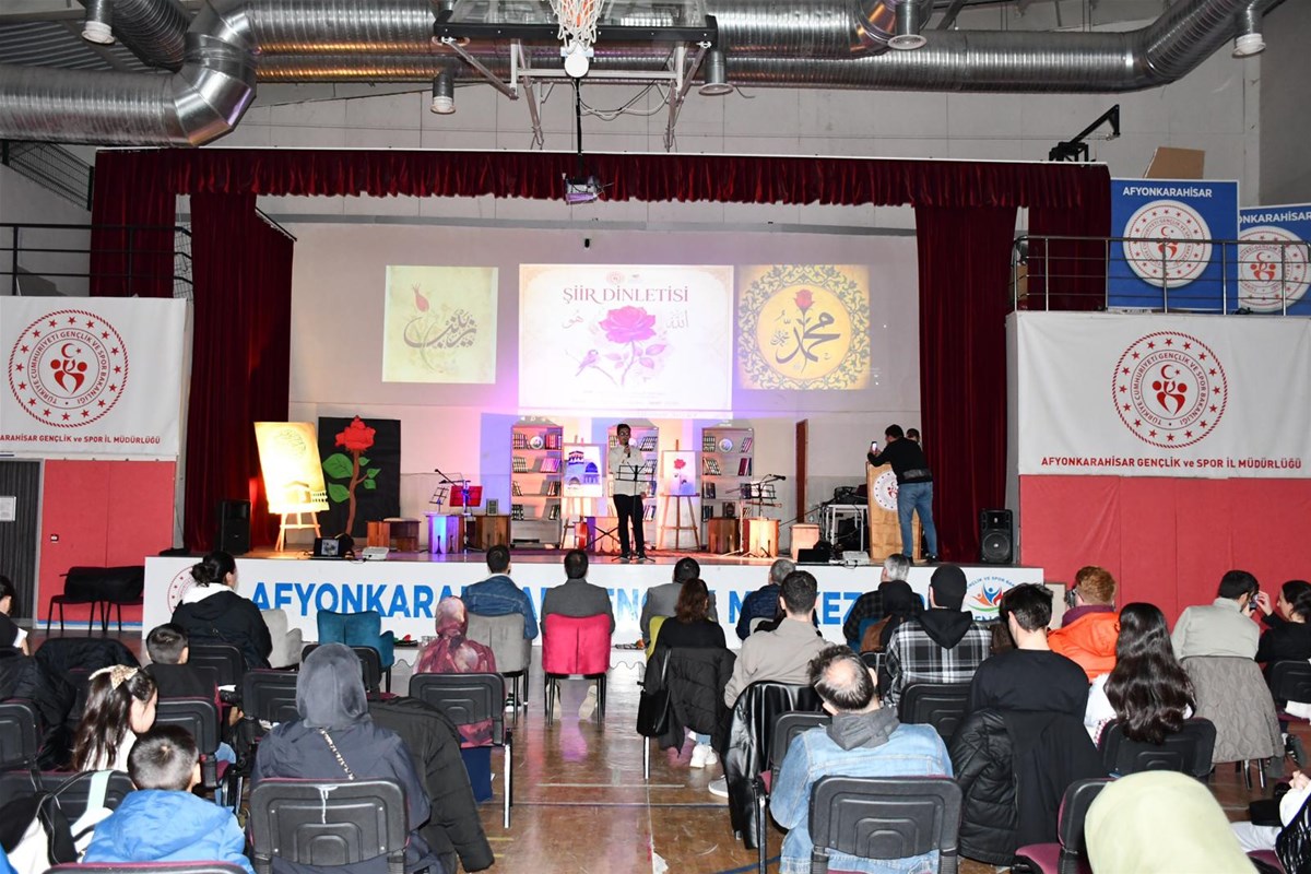Afyonkarahisar genelinde gençlik merkezleri tarafından düzenlenen şiir dinletisi programlarında, milli ve manevi değerler ön plana çıkarıldı. Şehit Ayhan Sarıçiçek Gençlik Merkezi’nde gerçekleştirilen şiir ve ilahi dinletisi programında, “ilahi aşk” teması işlendi. Programda, Peygamber Efendimize (s.a.v.) duyulan sevginin dile getirildiği şiirler okunurken, etkinlik ilahi dinletisiyle sona erdi.